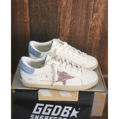 Women's Super-Star Sneaker with pink glitter star and Ice blue suede heel tab