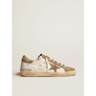 Super-Star sneakers in white leather with dove-gray suede inserts and all-over black lettering