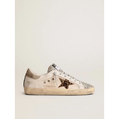 Super-Star sneakers with platinum-colored glitter tongue and leopard-print pony skin star