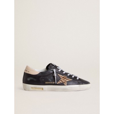 Women’s Super-Star in black nappa leather with zebra-print pony skin star and beige leather heel tab