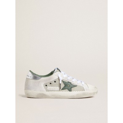 Women’s Super-Star LTD in white suede and mesh with green leather star and silver foiled leather heel tab