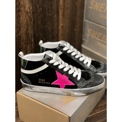 Mid Star Sneaker in black suede with hot pink star and abrase leather heel tab