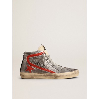 Women’s Slide with silver metallic leather upper and red metallic leather flash