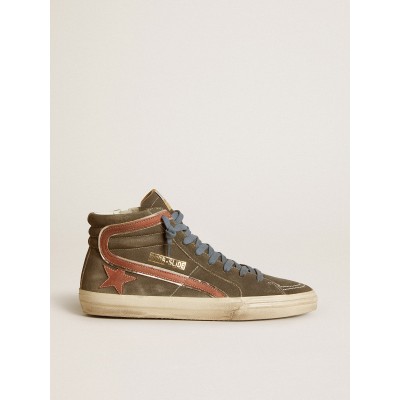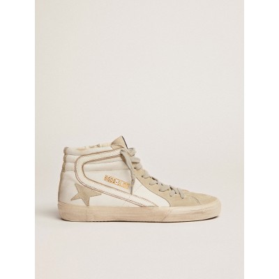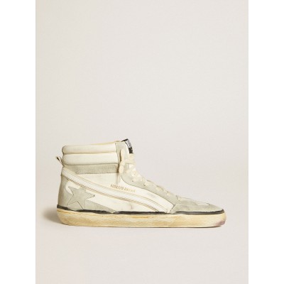 Slide LAB in aged-white nappa leather with gray suede star and white leather flash