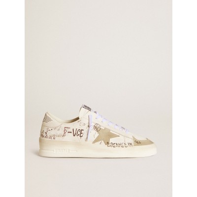 Stardan with beige suede star and toe and all-over lettering and patterns
