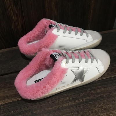 Women's Super-Star Sabot Sneaker in white leather and pink shearling lining with silver star