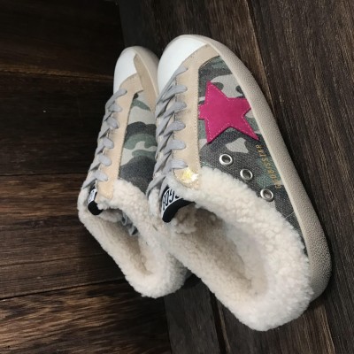 Women's Super-Star Sabot in Camouflage Oxford print and shearling lining with hot pink star