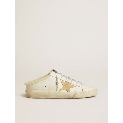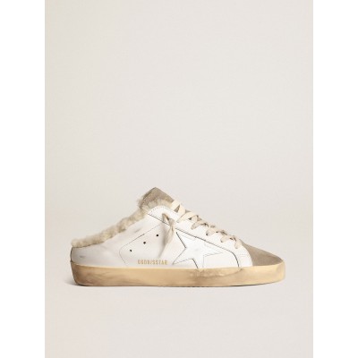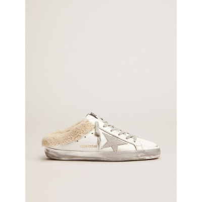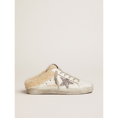 Women's Super-Star Sabot in white leather and shearling lining with silver glitter star
